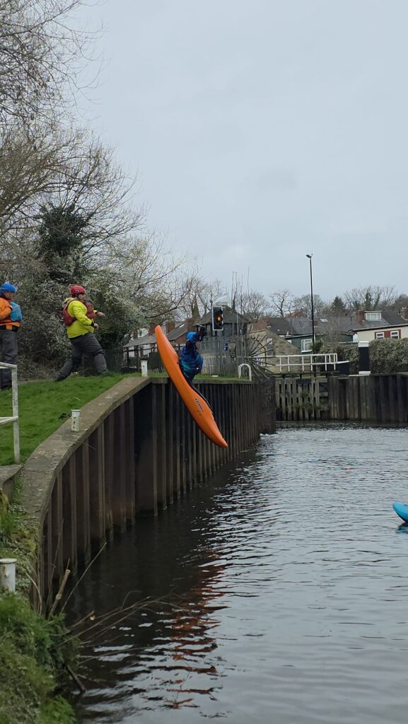After a few minutes playing on the waves the group (now including David) had a gentle paddle down to the old Mexborough Ferryboat Crossing where we moved onto the canal at Mexborough Top Lock. Introducing Paul Evans to seal launching from the canal bank. David and Frankie also joined the fun with Frankie’s playboat doing what playboats do in these situations. Two great rolls from Frankie.